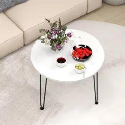 Tangkula Small Round Coffee Table W/ Thickened Tabletop & Metal Tripod Legs Faux Marble White
