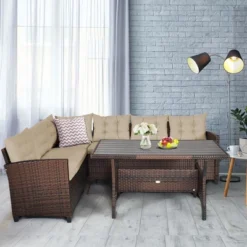 Tangkula 3PCS Rattan Dining Sofa Set W/6 Cushioned Seats Patio Furniture