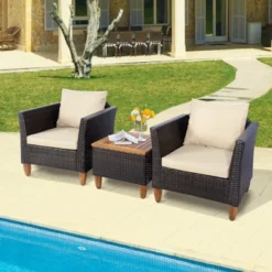 Tangkula 3 Pieces Outdoor Rattan Furniture Set Wicker Bistro Set Wooden Table Top With Cushions