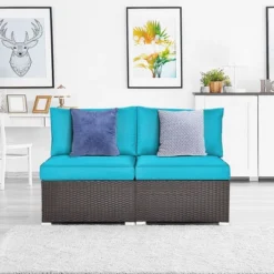 Tangkula 2PCS Patio Wicker Rattan Sectional Armless Chair Sofa W/ Turquoise Cushion