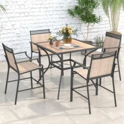Tangkula Patio Table For 4 People W/ Umbrella Hole Wood-Like Tabletop Metal Support Legs