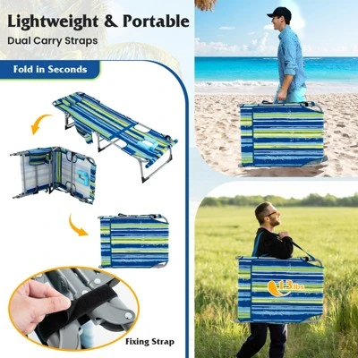 Our beach chaise lounge chair is really a a complete lounger with a soft cushioned pillow and a face hole who are tanning lovers! Made of high-quality oxford fabric, this sunbathing recliner is sturdy enough to stand the test of time. The premium metal frame is durable and heavy duty for both indoors and outdoors with a load-bearing capacity of up to 400 lbs. Featuring 5 different backrest positions and 2 adjustable leg positions, the patio lounge chair provides extraordinary comfort and relaxation for you. When not in use, the chaise lounge chair can be folded into a compact size in seconds. Can be used both indoors and outdoors, such as beach, office, yard, lawn, etc.