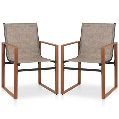 Optimize your outdoor relaxation with the outdoor dining chairs set of 2. The ergonomic backrest of the patio chair features an optimal tilt angle that is engineered to provide unparalleled support to your back. Plus, the integrated armrests ensure a truly delightful sitting experience, while the wide seating area offering ample space for you to move freely. Crafted with breathable fabric, the seat and backrest of this chair ensure that you stay cool even during long hours of sitting. Also, the fabric is wear-resistant and non-fading for extended use. Furthermore, the armrests of the 2 pack outside dining chairs features a wood grain finish, which enhances durability and aesthetic appeal.