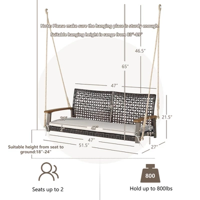 Enjoy your outdoor leisure time with our 2-seat porch swing chair!The mix brown PE rattan porch swing creates an elegant appearance while offering comfortable back and arm support. Comes with padded seat cushions,the porch swing will make you totally relax with high resilience sponge.And the wide seat allows you to sit together with your beloved ones.2 hanging hemp ropes and sturdy metal hooks ensure stability and safety during use. Please refer to the size description before purchase (there may be small dimensional discrepancies because of the manual measurement). Please do not tighten all the screws until all the holes are aligned.