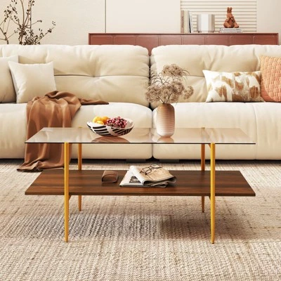 - Mid-Century Modern Charm: This coffee table is a stylish statement piece! The amber-colored glass and wood grain shelf add vintage elegance, while the golden tapered legs give it a modern touch that fits any decoration style.