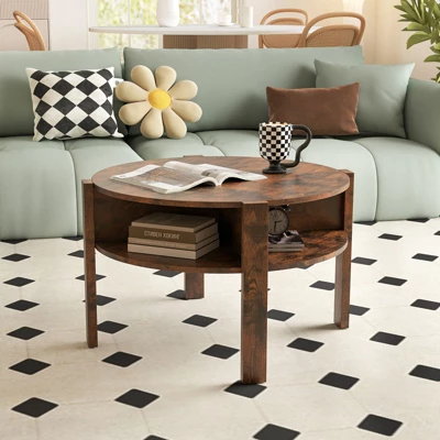 Elevate the aesthetic appeal of your living space with this timeless round coffee table featuring a classic wood grain finish that effortlessly complements any interior style. The elegant faux wood grain adds sophistication, instantly enhancing your room’s aesthetic appeal. Stay organized with the innovative 2-tier storage design, providing ample space for books, beverages, and decorative items within arm’s reach. Enjoy peace of mind with the reliable structure supported by sturdy feet and thickened boards, ensuring a stable table that stands strong through everyday use.