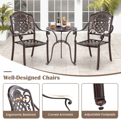 Elevate the comfort and style of your outdoor space with this set of 4 patio cast aluminum chairs. Featuring an ergonomic curved seat for enhanced comfort, these chairs are designed to provide a relaxing sitting experience. Each chair is equipped with adjustable footpads for stability on uneven surfaces, ensuring peace of mind while you unwind. Crafted from high-grade cast aluminum, these outdoor armchairs are weather-resistant and highly stable. The stackable design adds convenience, allowing for easy storage when not in use. Whether you’re creating a cozy spot for morning coffee or entertaining guests, these chairs offer functionality and aesthetic appeal.