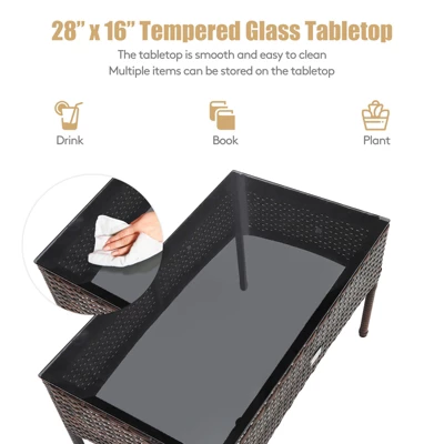 This patio conversation set of 3 is a great companion for your outdoor activities. Do you want to enjoy your leisure time in your backyard or garden? Do you always complain that your patio furniture can’t be exposed to heavy sunlight for too long? Our 3 pcs rattan conversation set will be a perfect solution for you. Heavy-duty steel frame wrapped with premium rattan offers extra-strong support to you. And our furniture set resists to sunlight, and high temperature, and is able to accompany you for a long time. When you feel tired, you can put your legs on the ottoman and rest your arms on the curved armrest. The tempered glass coffee table makes every daily items you want always at hand. Our patio conversation set will make you always satisfied during outdoor times.