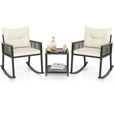 Upgrade your outdoor relaxation with this 3-piece patio rocking bistro set, designed for year-round enjoyment.The 2 rockers and the side table feature black round PE rattan that is breathable, sunproof, anti-fading and elegant for long-lasting beauty. The whole rocking set is supported by sturdy metal frame for strong support. The chairs boast ergonomic backrests and acacia wood armrests, while the elastic cushions provide more coziness. This outdoor rocking set also includes a 2-tier side table with a tempered glass top, ensuring easy access of food and drinks. Ideal for any porch, backyard, or poolside, this rocking bistro set with well-crafted details promises enduring style and relaxation.