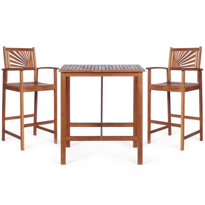 This dining set with 1 table and 2 bar stools, which is a perfect addition to compact space. With 1 large bar table and 2 ergonomic bar stools, this outdoor dining furniture set not only offers spacious space for your various belongings, but also brings comfortable sitting experience. Made of long-lasting acacia wood, this patio conversation set is perfect for outdoors, so you can use it in your backyard, poolside, garden and balcony, etc. After using, the table and stools can become a compact unit, which is easy for storage and transportation.