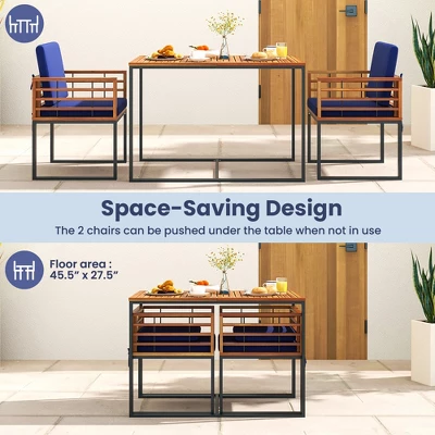 Elevate your outdoor dining experience with this exquisite 3-piece patio dining set, skillfully crafted from splinter-free acacia wood for unmatched durability and rustic appeal. With a heavy-duty, load-bearing metal framework and cushy, detachable cushions, this set promises both reliability and comfort. The spacious 43.5-inch table boasts a slatted design to prevent water pooling, ensuring ease of maintenance. Ingeniously designed to save space, the chairs tuck away under the table, perfect for compact outdoor areas.
