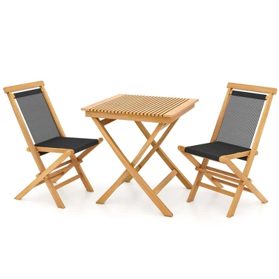 Transform your outdoor space into a cozy haven with our 3-piece patio bistro set!This set includes a perfect wood bistro table and a pair of well-designed chairs, each crafted from natural and sturdy teak wood to withstand long-time outdoor use. Thanks to the folding design of the chairs, this set can be easily stored or moved, allowing you to customize your setup as needed. The chairs are equipped with premium woven rope seats and backrests, adding a touch of elegance and comfort. This 3-piece bistro set combines both elegance and functionality, making it an ideal choice for extended conversations or a relaxing coffee break under the sun in your backyard, balcony, deck, garden, poolside, or porch.