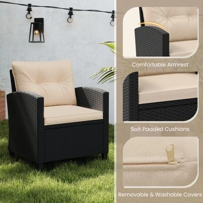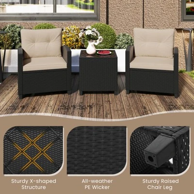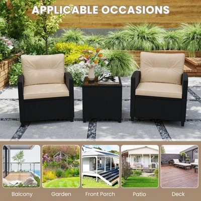- Appealing Rattan Beauty: Crafted with excellent black PE rattan, this 3-piece patio set adds a natural, charismatic charm to any outdoor setting. The well-woven and appealing wicker surface is also sunproof and anti-fading for extended service life.