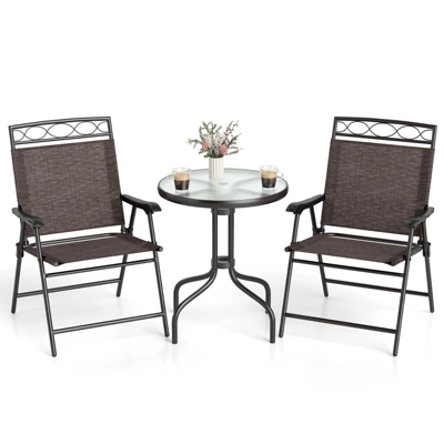 It includes a round table featuring a ripple-patterned tempered glass top that looks stunning and ensures durability and ease of maintenance. What’s more, the central hole in the bistro table is ready to accommodate an umbrella to cater to sunny and rainy days. The 2 provided chairs are foldable and easy to store. Not just portable, each chair is designed for your comfort with ergonomic backrest, armrests, and breathable fabric. Supported by a robust metal frame with adjustable foot pads, the patio furniture set promises both stability and adaptability to uneven surfaces. Perfect for patio, garden, poolside and more, the conversation set enhances your space and adapts to your lifestyle, promising year-round enjoyment outdoors. To extend the lifespan of the product, it is not recommended to expose it to rain.
