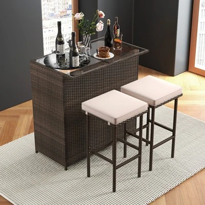 Cheers to comfort, style and endless summer nights with our 3-piece PE rattan patio bar set.Crafted with hand-woven PE wicker and featuring a sleek tempered glass tabletop, this outdoor bar set promises both resilience and a modern aesthetic. Moreover, this patio bar table and chairs set perfectly balances style and functionality, including a 39″ bar table matched ideally with 28″ stools, all enhanced by conveniently placed 12.5″ and 11″ footrests for peak comfort. Built-in storage shelves under the table ensure essentials are within easy reach, while removable cushions on each stool promise easy maintenance and cozy seating.