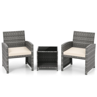 Discover the epitome of outdoor relaxation and style with the 3 pieces wicker furniture set. Designed for year-round enjoyment, the resilience of PE wicker is combined with a robust metal frame to ensure durability and stability. The coffee table features a sleek tempered glass top, providing a sturdy surface and an elegant look. Below the tabletop, an open shelf offers ample space to store your reading materials, beverages, decorative plants, etc, keeping your essentials within reach and your space neat. The thick padded cushion promises to envelop you in unmatched comfort, while the zippered cover allows for easy maintenance.