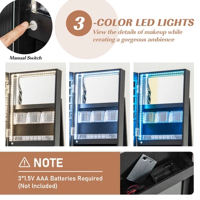 - 【3-Color LED Lights & Foldable Makeup Tray】: The LED strip around the internal makeup mirror will automatically turn on when you open the door, and the light can be switched to natural light, blue light and white light to meet your different makeup needs. (The light is powered by 3 AA batteries, not included). Besides, the foldable makeup tray can be opened at any time to place your eyebrow brushes and lipsticks.