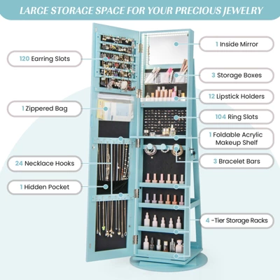 - 360° Rotating & Lockable Design: The base of the jewelry cabinet is 360° freely rotatable, allowing you to find the desired angle or get access to the storage shelves effortlessly. Moreover, the cabinet door is lockable and 2 keys are included, which keeps your jewelry and makeup away from children.