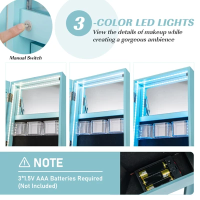 - Built-in Makeup Mirror & LED Lights: The inside space is equipped with a mirror and a folding acrylic table, which is convenient for making up or trying on. In addition, the LED lights will automatically turn on when you open the door, which brights up your beauty in the dark. Also, the LED light features 3 adjustable colors for you to choose.