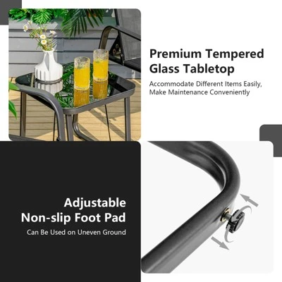 - 『Compact Coffee Table』: For your convenience, this patio bistro set is equipped with a coffee table to accommodate different items and make them within reach. Besides, the high quality tempered glass tabletop is safer and sturdier to use. And the adjustable non-slip foot pads fit uneven ground while adding strong stability.