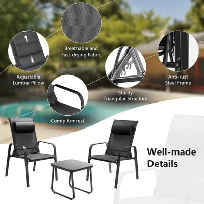 - 『Outdoor Stackable Patio Chairs』: This 3-piece patio bistro furniture set features a convenient coffee table and 2 comfy dining chairs, which allows you to use it in the compact space, such as porch, patio and poolside, etc. If you want to create extra space for kids to play, just stack 2 chairs together for space-saving. The length of each stackable chair is 35”.