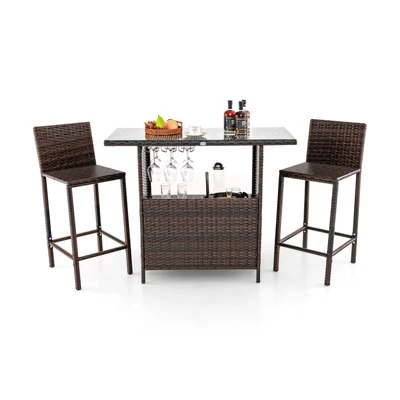 Indulge in the ultimate outdoor leisure experience with this exceptional 3-piece patio bar set. The elevated bar chairs and table provide the ideal height to enjoy a delightful meal or a glass bottle in utmost comfort. Each bar chair is meticulously designed to offer an optimal level of coziness, featuring a plush backrest and convenient footrest. Additionally, the bar table boasts ample storage options, including a spacious tabletop, double metal shelves, and stemware racks. The smooth, easy-to-maintain tempered glass tabletop enhances the overall aesthetic appeal. Constructed from rustproof metal and meticulously hand-woven with long-lasting PE rattan, this entire set guarantees a long-lasting service life.
