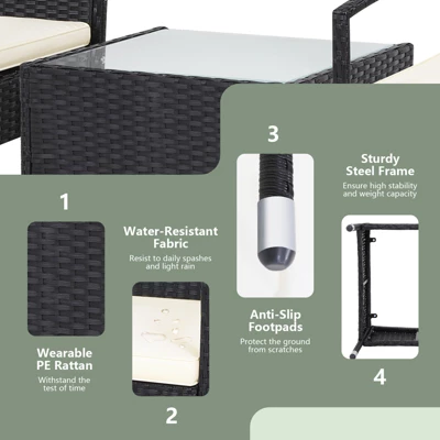 - 【Modern & Compact Design】 This rattan patio furniture set is designed with unique artistic feeling. With premium weaving techniques, the rattan sofas and table will add beauty to your patio or backyard. Compact design is great for a small deck, balcony and apartment. It doesn’t take up a lot of space while giving you comfortable seats and large display tabletop.
