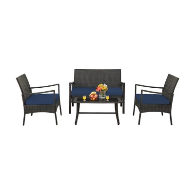 Enjoy soothing relaxation with friends or family on this 4-piece patio rattan chair set!Ergonomic single chairs and loveseat with soft cushions can relieve your fatigue and stress. And all the chairs are super sturdy with high-strength metal frame. Moreover, the coffee table with suitable size makes snacks and drinks easy to take. Its tempered glass tabletop is also easy to maintain. Plus, the PE rattan surface adds a piece of elegance and fits outdoor use perfectly. You can also arrange the 4 pieces as you want. And this 4-piece outdoor wicker chair set is ideal for backyard, poolside, front porch and so on.