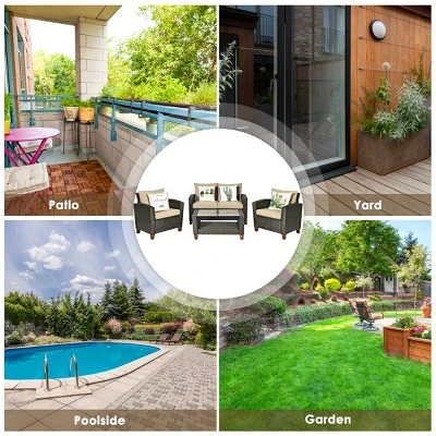 If you are looking for a conversation set for your outdoor space, our 4 pieces rattan conversation set will be your ideal choice. It comes with 1 loveseat, 2 single sofas and 1 coffee table. Constructed with high quality steel and tight rattan, this set is sturdy and long-lasting. And it can serve you for a long time. There are 4 seat cushions and 4 back cushions, providing you with a comfortable sitting experience. Moreover, you can have a good coffee time with the coffee table which can hold drinks and snacks. The table also has a lower shelf, which offers more storage space. Our furniture set is suitable for patio, garden, poolside and other places. Don’t hesitate to take it home!