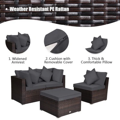 This 4-piece rattan sofa set with a stylish and simple design is perfect for your outdoor living space! Featuring 2 corner sofas, 1 armless sofa and 1 ottoman, this patio furniture set can be combined in various ways to meet your different needs. Crafted from a sturdy steel frame wrapped with weather-resistant PE rattan, the patio furniture set is sturdy and long-lasting for long lasting use. Thick lofty sponge padded cushions and pillows will provide luxurious comfort for you and the cover of cushion can be removed with the smooth zipper for easy cleaning. Moreover, the simple and stylish design enables you to put this sofa set in any place such as backyard, patio, garden, porch or indoors if you want.