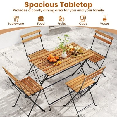 Enhance your living space with this elegantly crafted 5/3-piece patio dining/bistro set, featuring a sleek design that balances functionality and style. Constructed from premium acacia wood, the tabletop, seat and back of this furniture set withstand long-time use and showcase much elegance. The whole table and chair set is supported by solid metal frames with anti-slip foot pads for added stability, while fixing screw of support rods ensures reinforced strength. The quick-folding chairs offer practicality and ease, allowing for simple storage and transport. Whether positioned indoors or outdoors, this patio set fits seamlessly into any setting from garden to dining room.