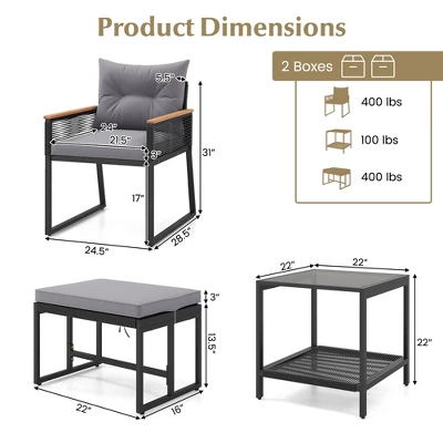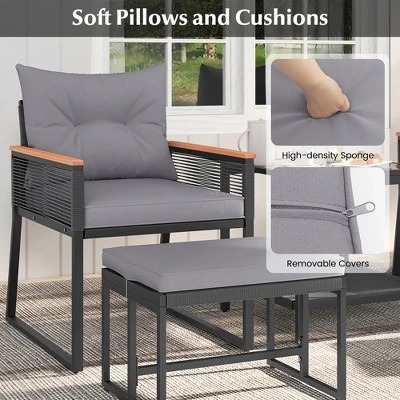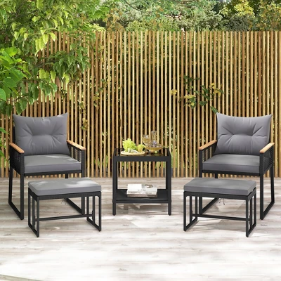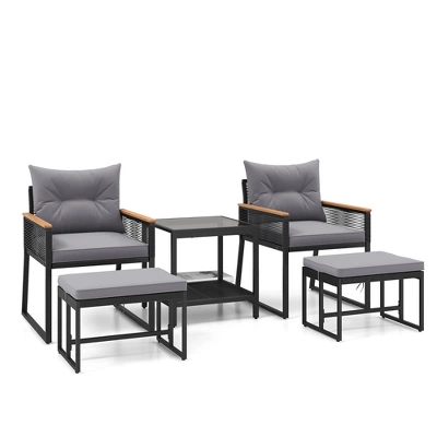 Elevate your outdoor space with our 5 piece patio furniture set!The outdoor furniture set is designed for ultimate relaxation, featuring plush pillows and cushions filled with high-density sponge. The zippered cushion covers make cleaning easy, ensuring an inviting seating experience at all times. Crafted from premium PE rattan and supported by a sturdy metal frame, this patio conversation set is built to last. The acacia wood armrests provide extra comfort and relaxation for your arms. With its 2-tier structure, the tempered glass top coffee table offers ample storage space to keep outdoor essentials close at hand. This outdoor conversation set is versatile and perfect for any outdoor space, such as a porch, terrace, garden, or poolside.