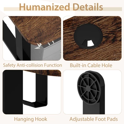 - More Humanized Details: In addition to the above features, the electric standing desk is designed with user’s convenience in mind. For example, the tabletop with safe round corners can avoid bumping accidents. And aside the tabletop, there is a hanging hook for headphones or things like that. More importantly, the adjustable foot pads keep the desk from wobbling.