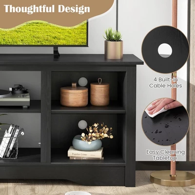 Elevate your living room with our TV stand!Boasting a generously-sized 58″ x 16″ tabletop, along with 6 open cubbies, this TV cabinet offers ample room to display a screen of up to 65″ while efficiently organizing other media devices. With removable and 3-position adjustable shelves, you can customize center space as needed: use it as a 2-tier shelf for storing different sized items or an open cubby for accommodating a 18″ fireplace (not included). This TV stand ensures tidy cable organization. Thanks to the modern and simple style, it not only serves as a TV stand, but also works great as a fireplace console table or storage cabinet for your bedroom, study, hallway, etc.