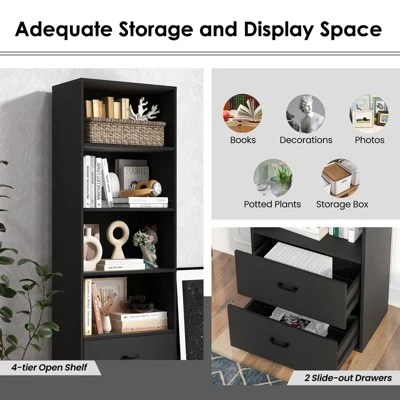 Our bookcase is a firm and well made piece! 4-tier self and 2 drawers provide ample storage and classified space for a variety of items, which can well suit your storage needs. Crafted of durable engineered wood, our bookcases are sturdy and reliable for long-term use. Equipped with anti-tilting device, the bookcases are not easy to wobble or collapse. Additionally, its modern design and elegant appearance make it match with any home decoration style, which works well in the home and office.