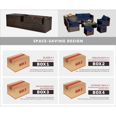 Revamp your outdoor living space with this versatile 8-piece outdoor furniture set! Featuring a tempered glass coffee table, a storage box, two ottomans, two armless sofas, and two corner sofas, this outdoor conversation set offers endless layout possibilities for your outdoor area. The soft cushions and ergonomic backrests provide a comfortable seating experience, and when not in use, this patio sectional set can be easily transformed into a compact size, saving valuable space. Built to withstand the elements, the set is equipped with a waterproof cover, all-weather PE rattan, anti-rust steel frame, and non-slip foot pads for durability and stability. Additional cushion cover sets are included for convenient replacement.