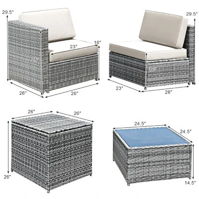 Our rattan furniture set consists of four armless sofas, two corner sofas of similar size, a coffee table and a storage box. Made of premium rattan material and supported by solid steel frame, this furniture set is sturdy, deformation resistant and durable. Sponge cushions bring comfortable and soft experience. Besides, these cushions are detachable with zip, which are easy to clean. 8 pieces including sofa, table and storage box offer you multiple combinations depending on your need, which is suitable for outdoor places like patio, garden, poolside and balcony!