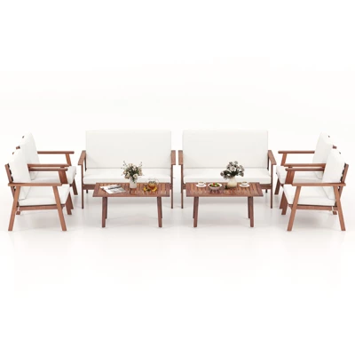 Enjoy ultimate comfort with this 8-piece acacia wood patio furniture set. The loveseat and single sofas come with seat and back cushions filled with high-density material, offering a cozy and relaxing seating experience. The cushion covers feature convenient zippers for easy maintenance. Additionally, the main frame of the furniture set is constructed from high-strength acacia wood, providing stability, resistance to deformation, and a touch of natural elegance. The inclined backrests and armrests on the loveseat and single chairs enhance overall comfort, while the reinforced crossbars ensure durability. Customize the arrangement of the 8 pieces to suit your outdoor space, whether it’s your backyard, poolside, or front porch.