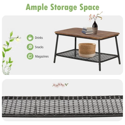 - Coffee table with acacia wood tabletop and lower shelf for ample storage space.