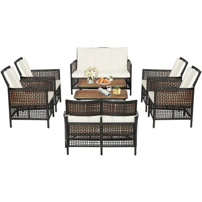 This 8-piece patio rattan set will allow you relax with your family or friends happily and comfortably. Constructed of rustproof steel frame and weather-resistant PE rattan, this furniture set are of high stability and suitable for long-time outdoor use. With curved armrests and backrests, both the loveseat and single chairs will make you sit without tiredness. In addition, the sofa set will bring you comfortable sitting experience with seat cushions and back cushion. The zipper design makes the cover of cushions easy to remove and clean. The 2-tier coffee table with wide acacia wood tabletop and lower shelf provides you with sufficient storage space and offers much convenience for your relaxation.
