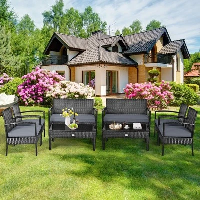 It’s time to consider replacing traditional chair and table with our rattan conversation set. Our rattan furniture set includes 2 loveseats, 4 single chairs and 2 coffee tables. Our rattan chair set combines the beauty and practicality, providing you comfortable experience to enjoy leisure time with your family. As a perfect addition to any porch or patio, the outdoor rattan chair set is made of premium PE rattan and sturdy steel for long time use. Our rattan chair set is equipped with a coffee table which is made of tempered glass and can offer ample space for you. This modern rattan chair set is suitable for garden and balcony. If the cushion gets dirty, you can simply zip off the cushion covers and wash it.