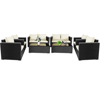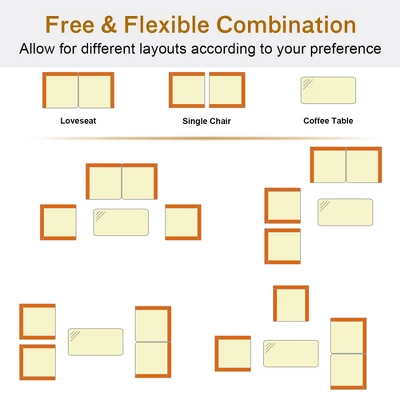 This set includes 2 loveseats, 4 single sofas and 2 coffee tables