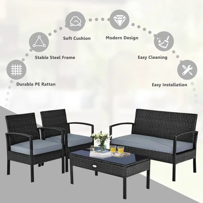 Made of solid steel and premium PE rattan materials, the structure of chairs and table is stable and they are not easy to deform. Come with soft sponge cushion which can make you feel more relaxed when sit on it. The wide and deep chairs will provide enough room for you and your friends to sit comfortably. The tabletop is made of premium tempered glass which is high temperature resistant, which is an ideal place for coffee, drinks, snacks and magazines. Sit on the sofas and enjoy the sunshine with your family!