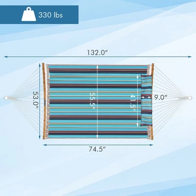 - Comfortable Hammock: Featuring double layers polyester fabrics and wadding inside, the hammock presents superior softness and comfort. Also, it is more resistant to fading than other quilted hammocks, allowing for a longer service life. Importantly, the 132” x 53” hammock is wide enough for 2 people to take a rest.