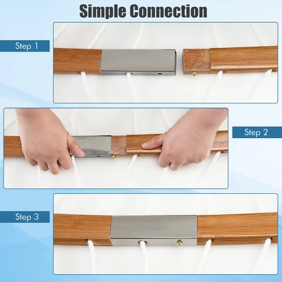- Reliable Connection: On both sides, the hammock set comes with two 53” long bamboo spreader bars fitted with various countersunk holes, minimizing frictions between ropes and booms. With two 10.5” long chains which can also be used for length adjustment, the hammock can be connected to the steel stand stably.