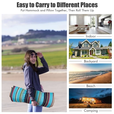 - Various Suitable Places: Designed with a colorful look and rustic hand-woven ropes, the hammock with stand included can blend harmoniously into diverse vacation spots and home leisure area. More, a detachable pillow is provided, so you can lie comfortably on summer nights and watch the starry sky with your kid.