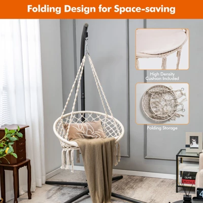 The bohemian style adds charm to your indoor and outdoor places, and you can place it on the balcony, living room, garden and more. When you’re ready to relax, hang it from any sturdy overhang to create a cozy resting spot. And there are 2 hanging ways for endless fun. The durable handmade cotton ropes ensure a safe and smooth swing. Plus, all necessary accessories are included for convenient use. With folding design, you can fold it into a compact size when not in use for space-saving.
