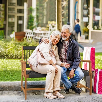 Just sit on our garden bench with your beloved one!Made of all-weather hand-woven plastic ropes and supported by solid acacia woods, this outdoor bench gives you strong support. Meanwhile, the large and deep seat create enough space for 2 people to sit together. After that, the inclined backrest and cozy armrests make this patio bench comfortable enough for a long time sitting, extending outdoor leisure time.