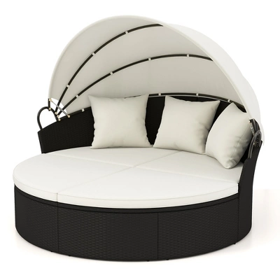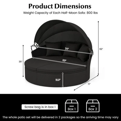 This stylish and functional rattan daybed is perfect for outdoor relaxation. The daybed includes two half-moon sofas which can be separated, creating a versatile conversation set. And the 66″ wide seat provides ample space for comfortable lounging. With 4 seat cushions and 3 throw pillows, you can enjoy a cozy sitting experience. In addition, the retractable canopy offers sunshade on hot days and is made of durable sunproof and waterproof fabric. Moreover, made with premium black PE rattan and a sturdy metal frame, this daybed is built to withstand outdoor conditions. Enjoy backyard or poolside relaxation with this patio daybed!