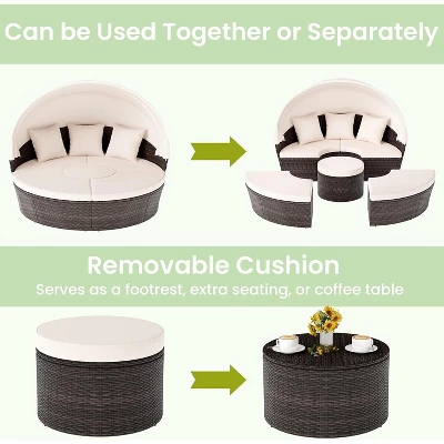 Enhance your outdoor relaxation area with our patio round daybed! Crafted with hand-woven PE rattan, this outdoor sunbed effortlessly combines durability and style. The adjustable canopy allows for personalized comfort, supported by a premium gas strut and secured with fixing ties. The sturdy metal frame adds to its stability and longevity. Complete with a bench, 2 chairs, and a center table, this sectional seating set can be used together or separately to suit your needs. The set includes 3 throw pillows and 4 seat cushions for enhanced comfort levels. Whether placed on your patio, yard, or poolside, this outdoor round daybed is a fantastic choice.